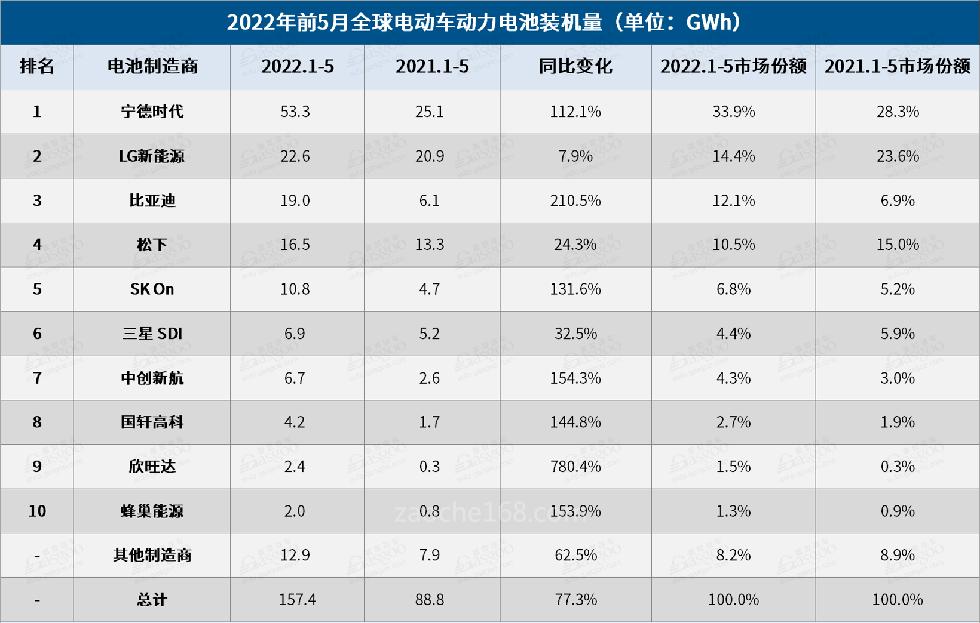 2022年1月至5月,全球電動(dòng)汽車電池裝機(jī)量為157.4 GWh,同比增長(zhǎng)77.3%,維持了自2020年第三季度以來的持續(xù)增長(zhǎng)趨勢(shì)。以寧德時(shí)代、比亞迪為首的一批中國電池企業(yè)以強(qiáng)勢(shì)增長(zhǎng)的中國電動(dòng)汽車市場(chǎng)為后盾,領(lǐng)跑市場(chǎng)增長(zhǎng),而中創(chuàng)新航、欣旺達(dá)等大部分中國電池企業(yè)的市場(chǎng)份額都有所增加。