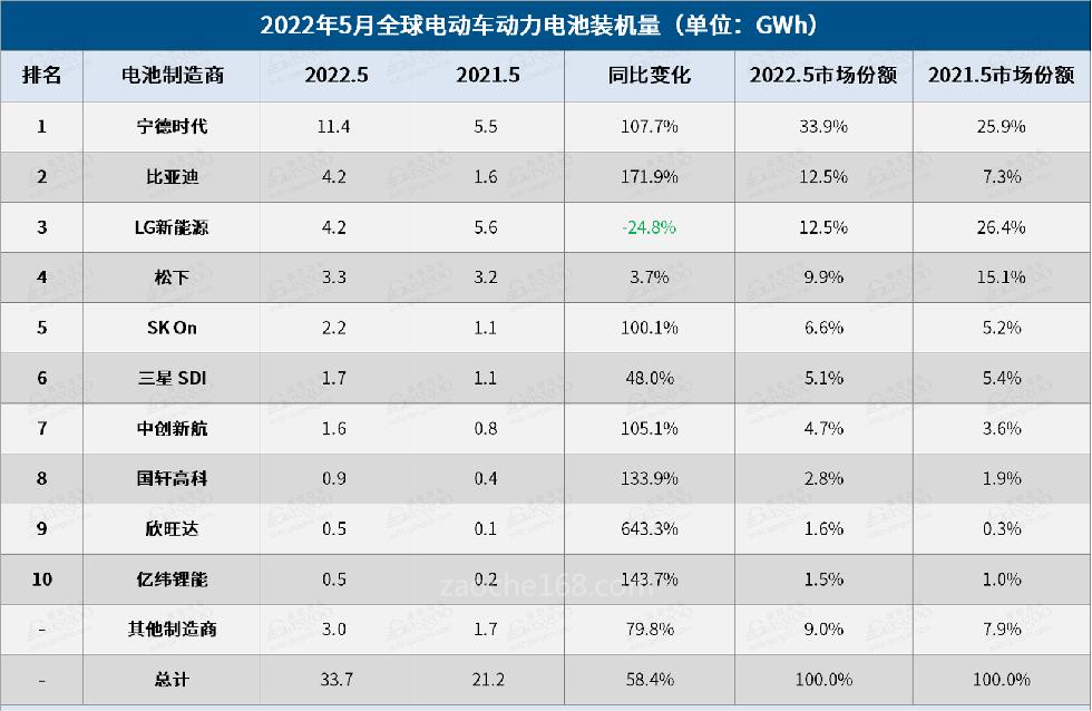 在5月全球電動(dòng)汽車電池裝機(jī)量榜單中,寧德時(shí)代以11.4 GWh的裝機(jī)量和33.9%的市場(chǎng)份額位居第一,并且是全球唯一一家裝機(jī)量超過10 GWh的電池企業(yè)。比亞迪和LG新能源的裝機(jī)量均為4.2 GWh,市場(chǎng)份額均為12.5%。但是,比亞迪的裝機(jī)量同比大漲171.9%,而LG新能源的裝機(jī)量同比減少24.8%,并且是榜單中唯一一家裝機(jī)量同比下跌的電池企業(yè),市場(chǎng)份額也減少13.9個(gè)百分點(diǎn),排名再度保持第三不變。