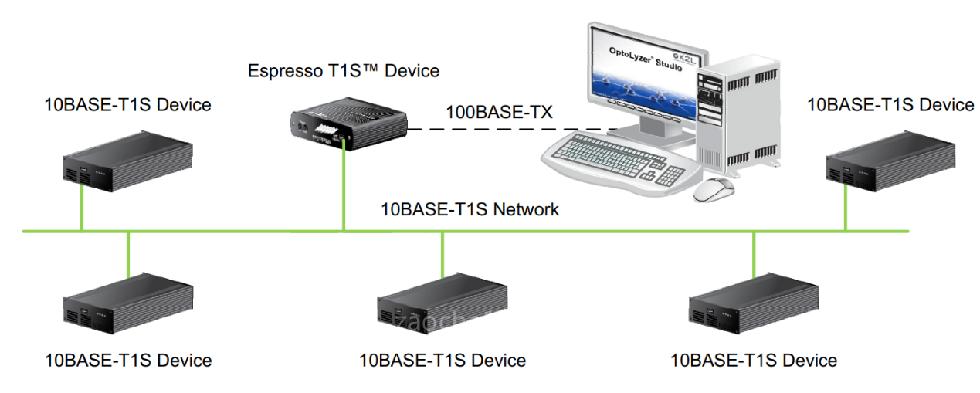 此外,Espresso T1S設備配備了兩個10BASE-T1S連接器(每個有兩個針腳),而且Espresso T1S設備可以通過配備的連接器連接到10BASE-T1S網(wǎng)絡中,還可以通過一個10/100BASE-TX接口連接到PC上并進行數(shù)據(jù)和控制通信。并且,把Espresso T1S設備與OptoLyzer? Studio軟件結(jié)合使用,我們可以很容易地進行10BASE-T1S總線系統(tǒng)檢測。