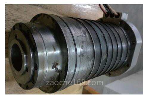 (1)電主軸外觀 電主軸(見圖1)是將主軸和電動(dòng)機(jī)合二為一的機(jī)床部件,將主軸部件的主軸部分適當(dāng)延長后,直接在延長段加裝電動(dòng)機(jī)轉(zhuǎn)子,使電動(dòng)機(jī)與主軸同軸,并在轉(zhuǎn)子外部加裝定子線包封閉,形成同軸電動(dòng)機(jī),電動(dòng)機(jī)工作時(shí)直接帶動(dòng)主軸工作。