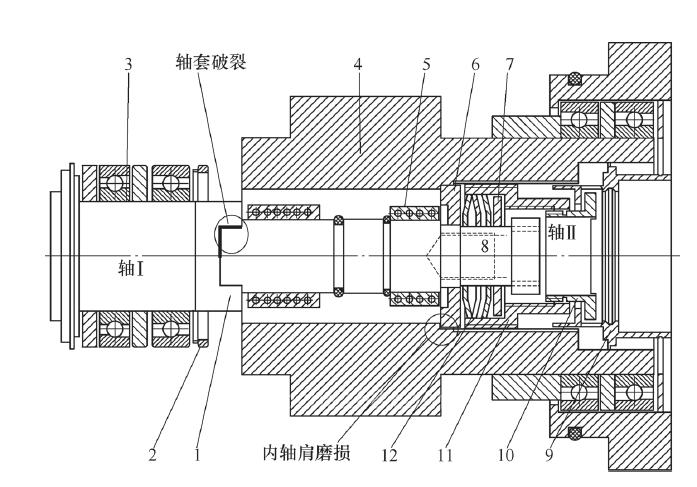 (2)故障分析 出現(xiàn)主軸不轉(zhuǎn)故障,轉(zhuǎn)子軸內(nèi)的內(nèi)六角圓柱頭螺釘松動(dòng),在主軸高速旋轉(zhuǎn)的過程中,軸Ⅱ與墊片運(yùn)轉(zhuǎn)不同步,墊片會(huì)在軸Ⅱ內(nèi)部自轉(zhuǎn),墊片與軸Ⅱ的材料不同,并且墊片比軸Ⅱ的硬度高。主軸經(jīng)常這樣工作,造成軸Ⅱ內(nèi)軸肩處磨損,致使軸Ⅱ內(nèi)軸肩處與軸套端面間的距離縮短,但是軸Ⅰ上的軸套與墊片左端面之間的距離保持不變,這就會(huì)出現(xiàn)“軸變長”的現(xiàn)象,導(dǎo)致轉(zhuǎn)子軸整體不能預(yù)緊,軸向竄動(dòng)0.5mm;同時(shí)又造成了軸Ⅰ與軸Ⅱ的同軸度超差。軸Ⅰ與軸套是緊配合,軸套的破裂使軸套可以繞軸Ⅰ自轉(zhuǎn),這樣主軸在高轉(zhuǎn)速旋轉(zhuǎn)時(shí),會(huì)出現(xiàn)軸Ⅰ與軸Ⅱ的運(yùn)轉(zhuǎn)不同步,造成電主軸的負(fù)載過大,電流增大。電主軸長期這樣工作,會(huì)導(dǎo)致線圈燒壞,電氣元件老化,縮短使用壽命。