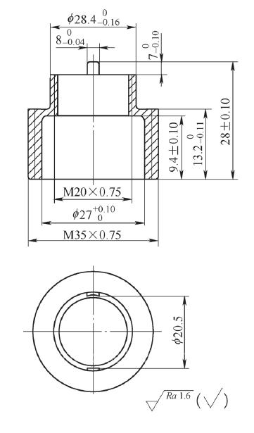 3)消除軸Ⅰ和軸Ⅱ軸向間隙。軸Ⅰ上裝有帶凹槽的軸套,空心軸與軸套裝配如圖7所示。軸Ⅱ上設(shè)計(jì)有與軸套的凹槽相配合的凸緣(見圖8)。在裝配時(shí),以空心軸和墊片為基準(zhǔn),通過旋緊內(nèi)六角圓柱頭螺釘,可以消除軸Ⅰ的軸向竄動(dòng)。以空心軸的外圓軸肩和軸承內(nèi)環(huán)為基準(zhǔn),通過旋緊空心調(diào)節(jié)螺釘,間接拉緊軸套,可以消除軸Ⅱ的軸向竄動(dòng)。