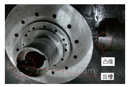 3)配做軸Ⅱ上的墊片,增加其厚度5mm,并在靠近滑動(dòng)軸承端銑槽,槽深2mm(試裝時(shí)槽深分別為0.5mm、1mm、1.5mm和2mm)。配做軸Ⅱ上的調(diào)節(jié)螺母(見圖6)。