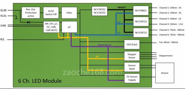 安森美的LED驅(qū)動(dòng)模塊具備更高的集成度和可靠性,平臺(tái)化設(shè)計(jì)提供擴(kuò)展性和靈活性,適用于各種前照燈設(shè)計(jì),智能的功能分區(qū)有助于降低成本,還實(shí)現(xiàn)獨(dú)特的前向照明效果,減少碳排放,有助于電動(dòng)車增加續(xù)航。如圖1是一個(gè)前照燈系統(tǒng)中LED驅(qū)動(dòng)電路的框圖,這6通道LED模塊可驅(qū)動(dòng)多組LED燈串,對(duì)應(yīng)遠(yuǎn)光燈、近光燈、柱形燈、角燈、轉(zhuǎn)向燈等,含LED驅(qū)動(dòng)芯片、步進(jìn)電機(jī)驅(qū)動(dòng)芯片、各種傳感器接口、電源及電源管理芯片、接口保護(hù)芯片、車聯(lián)網(wǎng)芯片SBC和單片機(jī)等,是個(gè)可自主工作的小系統(tǒng)。