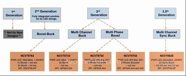 安森美已開發(fā)了4代SPI-LED驅(qū)動(dòng)產(chǎn)品。第2代是Boost-Buck芯片NCV78763,第3代有多通道的Buck芯片NCV78723和多相Boost芯片NCV78702、NCV78703,最高輸出電壓達(dá)60 V,是目前市面上同類型產(chǎn)品中電壓輸出能力最高的,第3.5代是多通道同步整流Buck芯片NCV78825,驅(qū)動(dòng)電流能力可達(dá)3 A,也是目前市面上同類型產(chǎn)品中電流驅(qū)動(dòng)能力最大的。第3代以后的產(chǎn)品適用于3組以上的LED燈串。