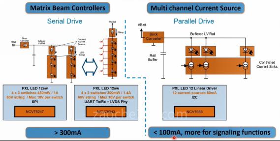 在廣泛的車燈中,LED燈組有兩種驅(qū)動(dòng):串聯(lián)型和并聯(lián)型。上文介紹的矩陣/像素LED燈組是串聯(lián)型結(jié)構(gòu)。當(dāng)LED燈珠的額定工作電流大于300 mA時(shí),一般選擇串聯(lián)型結(jié)構(gòu),這種結(jié)構(gòu)的缺點(diǎn)是壓降大。安森美的LED驅(qū)動(dòng)芯片擁有最高可升壓至60 V 的Boost控制器,Buck芯片則負(fù)責(zé)控制整個(gè)燈串穩(wěn)定的電流輸出,因此安森美的采用Boost-Buck電源結(jié)構(gòu)的LED驅(qū)動(dòng)是這種串聯(lián)型LED燈串的理想方案,同時(shí)安森美的像素?zé)艨刂菩酒琋CV78247和NCV78343也完美地匹配這種串聯(lián)型的LED燈組。NCV78247集成了12個(gè)矩陣開關(guān),每個(gè)開關(guān)的過(guò)電流能力是1 A,含SPI接口。NCV78343也集成了12個(gè)矩陣開關(guān),每個(gè)開關(guān)的過(guò)電流能力提升到1.4 A,含UART接口,不但可用于由遠(yuǎn)近光組成的矩陣燈組,也適用于具有動(dòng)畫效果的轉(zhuǎn)向燈、日行燈、格柵燈、造型燈等場(chǎng)景。