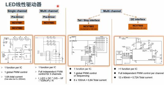 這類燈屬于信號(hào)燈,用于提醒周圍車輛和行人,本車即將要發(fā)生的駕駛意圖,包括轉(zhuǎn)彎、剎車、駐車等,同時(shí)車身上的各種造型也可作為汽車身份的一種標(biāo)識(shí),工作電流一般小于100 mA。車后組合燈有這些高階功能:增強(qiáng)型停車燈、尾燈、轉(zhuǎn)向燈是動(dòng)態(tài)的分段式燈光信號(hào),創(chuàng)新的車燈造型可實(shí)現(xiàn)以光束打造品牌、迎賓、動(dòng)畫等效果,可驅(qū)動(dòng)單串、多串LED燈珠,更高能效,更少損耗,并含安全診斷功能。安森美提供單通道和多通道LED線性驅(qū)動(dòng)器,如圖6所示,單通道預(yù)驅(qū)動(dòng)芯片有NCV7691/92,多通道預(yù)驅(qū)動(dòng)芯片有NCV7693,多通道直接驅(qū)動(dòng)芯片有專用于剎車、停車的NCV7683,以及帶I2C接口的NCV7685。