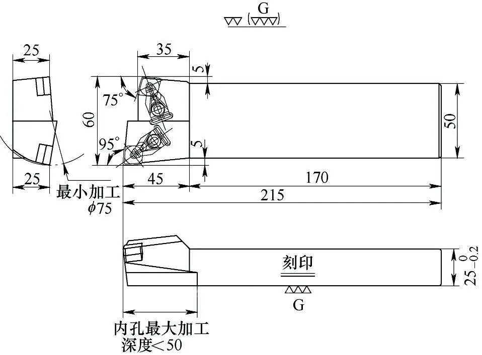 1)刀體長寬為170mm×60mm,由四方刀臺上3個緊固螺栓固定,因此刀體強度高,裝夾穩(wěn)定,抗振性好。通過試驗對比發(fā)現(xiàn),此刀具適合大切削量加工,切削次數(shù)由原來的兩次提升為一次,有效提高了加工效率,且零件表面質(zhì)量穩(wěn)定。