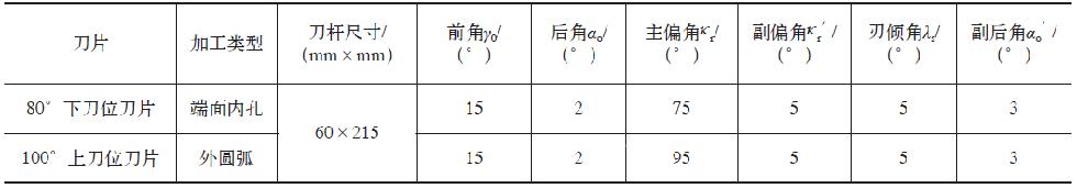 該復式組合刀具80°與100°刀片尖角的主要參數(shù)見表1。