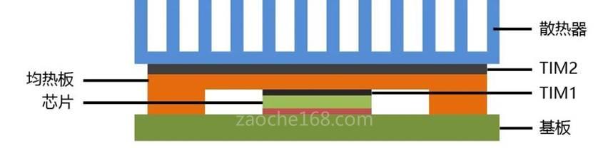 其中,Rimp為界面熱阻,T2為上接觸部件的界面溫度,T1為下接觸部件的界面溫度,Q為通過(guò)接觸界面的熱流通量。這里展示一個(gè)典型封裝結(jié)構(gòu):