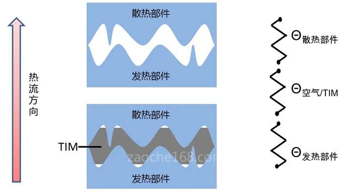 在熱量由芯片傳遞至散熱器的過(guò)程中,需要經(jīng)過(guò)多個(gè)固-固界面。當(dāng)兩個(gè)部件之間進(jìn)行接觸傳熱時(shí),由于固體表面從微觀上粗糙不平,部件之間實(shí)際上是通過(guò)離散的接觸點(diǎn)進(jìn)行接觸傳熱的,有研究表明,這之間的實(shí)際接觸面積不到部件對(duì)應(yīng)表面積的3%,因而產(chǎn)生了非常高的界面熱阻。當(dāng)界面填充有TIM時(shí),增加了實(shí)際的接觸面積,界面熱阻的數(shù)值也隨之減少。