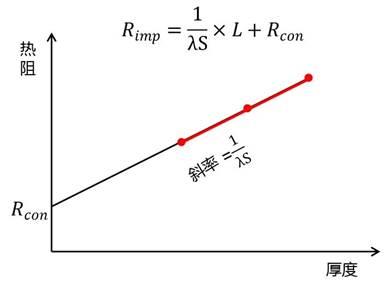 在具體的測(cè)試過(guò)程中,我們可以通過(guò)三點(diǎn)法測(cè)試不同厚度下的界面熱阻,進(jìn)而通過(guò)線性回歸的方法得到L=0時(shí)的熱阻,這個(gè)熱阻即為接觸熱阻R_con,而線性回歸的斜率即為1/λS,由此便得到了材料導(dǎo)熱系數(shù)的具體數(shù)值。