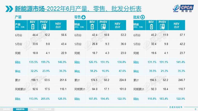 從乘聯(lián)會(huì)公布的終端數(shù)據(jù)來看,6月新能源乘用車批發(fā)銷量達(dá)到57.1萬輛,同比增長141.4%,環(huán)比增長35.3%。1-6月,新能源乘用車批發(fā)達(dá)到246.7萬輛,同比增長122.9%。