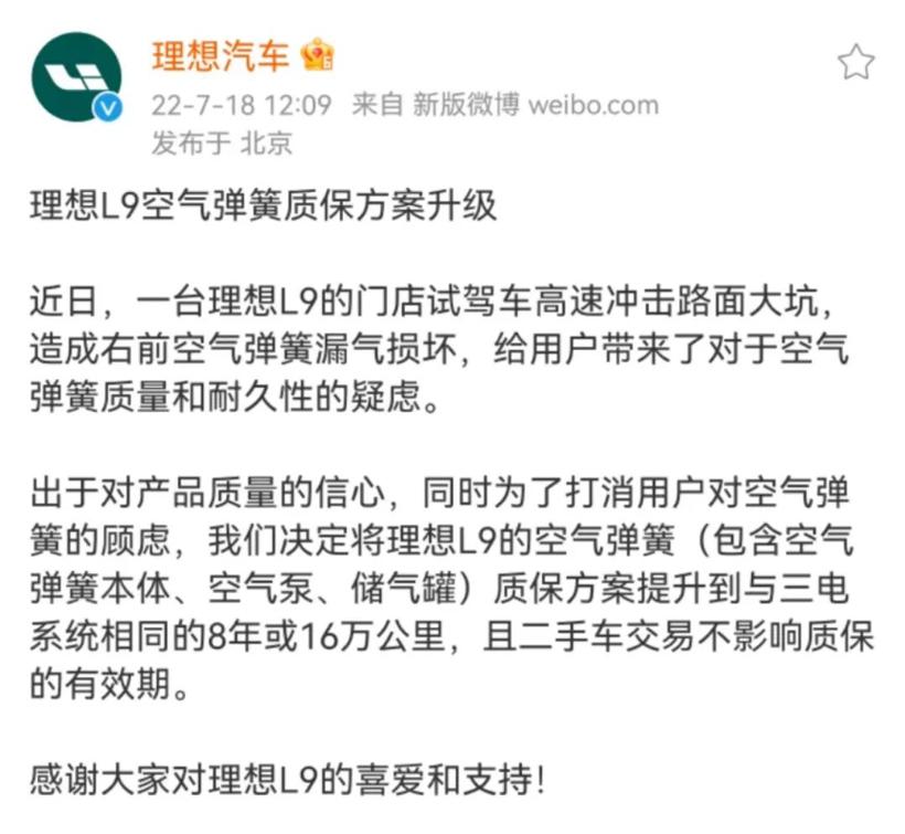 而就在昨天,為了打消用戶的疑慮,理想官方宣布將對(duì)理想L9空氣彈簧(包括空氣彈簧本體、空氣泵和儲(chǔ)氣罐)的質(zhì)保方案,提升到與三電系統(tǒng)相同的標(biāo)準(zhǔn)(8年或16萬公里),同時(shí)L9的二手車交易不影響質(zhì)保有效期。