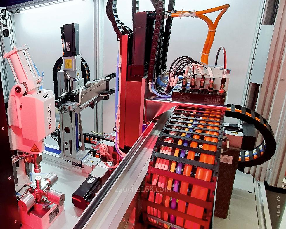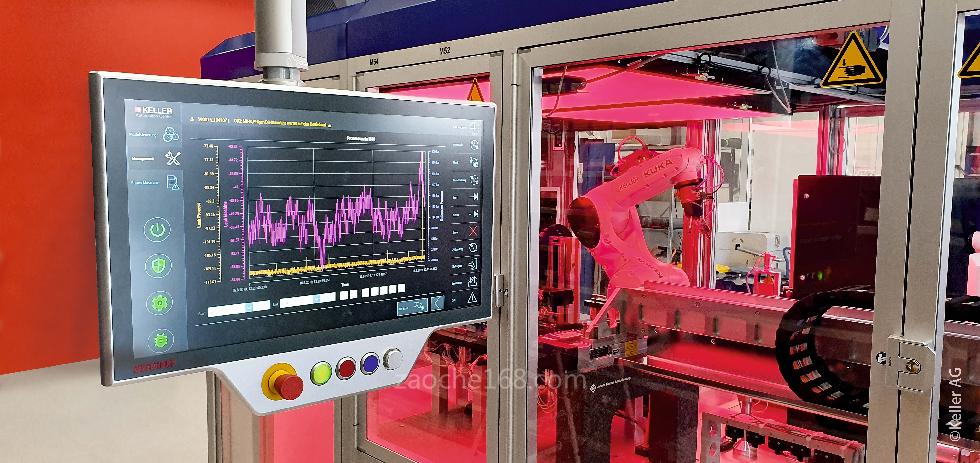 壓印是傳感器隔離膜片生產(chǎn)過(guò)程中一個(gè)不可或缺的的中間加工步驟,凱樂(lè)公司項(xiàng)目經(jīng)理 Florian Wernli 解釋道:“我們的大部分壓力傳感器都封裝在充油不銹鋼外殼中。隔離膜片對(duì)于通過(guò)油將周圍介質(zhì)的壓力傳輸至傳感器內(nèi)的測(cè)量芯片中來(lái)說(shuō)至關(guān)重要。”這就需要通過(guò)一臺(tái)性能強(qiáng)大的自動(dòng)壓印機(jī)將隔離膜片壓印成特殊的形狀。凱樂(lè)公司開發(fā)與生產(chǎn)裝備部 Bruno Thalmann 補(bǔ)充道:“在經(jīng)過(guò)泄漏檢測(cè)、用壓縮空氣清潔和熱平衡處理后,我們?cè)谕还に嚥襟E中使用氫傳感器在高壓條件下進(jìn)行壓印并進(jìn)行確定性泄漏試驗(yàn)。隨后使用圖像處理和人工智能進(jìn)行誤差檢測(cè)?!眽河C(jī)的核心部分是一臺(tái) KUKA 機(jī)器人,它用作拾放單元,將坯件送至加工位置,并將已完成的工件分成合格品(OK)和不合格品(NOK)兩個(gè)部分。