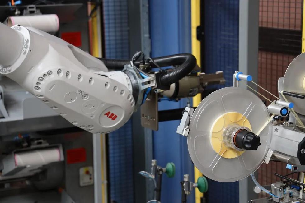 除了搬運(yùn)重物,機(jī)器人還能有效完成更精細(xì)的任務(wù)。每副成品線盤(pán)都會(huì)有一根開(kāi)放線頭,需要加以固定,以防止線在托盤(pán)上散開(kāi)。機(jī)器人能精準(zhǔn)地將線盤(pán)傳遞到加工站的具體位置,讓線頭貼上粘性標(biāo)簽得以固定。此外,自動(dòng)換盤(pán)會(huì)留下在接下來(lái)的加工步驟中并不需要的的“儲(chǔ)備線”。為了去除這些儲(chǔ)備線,機(jī)器人會(huì)將線盤(pán)移到另一臺(tái)加工設(shè)備上,用加熱絲將線燒掉并丟棄。