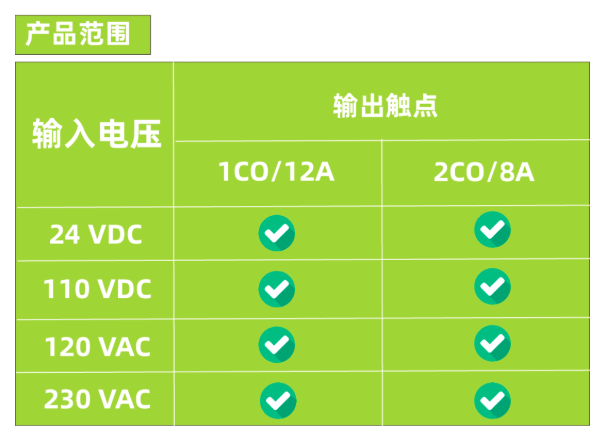 四種輸入電壓,24VDC,110VDC,120VAC,230VAC,可覆蓋大多數(shù)客戶的需求,輸出方面可選1CO/12A和2CO/8A觸點。帶LED指示功能并內(nèi)置保護模塊。