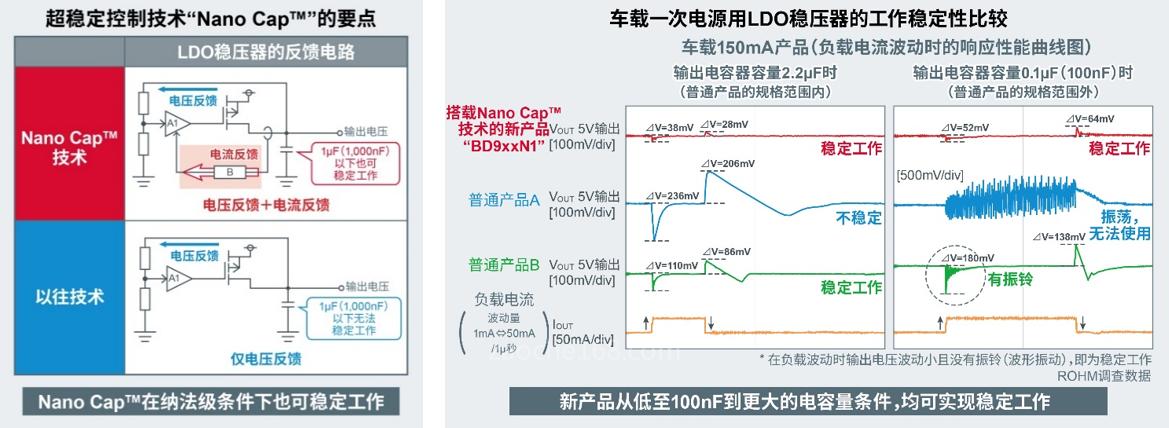 為了解決這些課題,ROHM于2020年確立了用于電源IC的超穩(wěn)定控制技術(shù)“Nano Cap?”。此次的新產(chǎn)品通過搭載Nano Cap?技術(shù),實(shí)現(xiàn)了在輸出電容器容量非常小的條件下也能穩(wěn)定工作的LDO穩(wěn)壓器。
