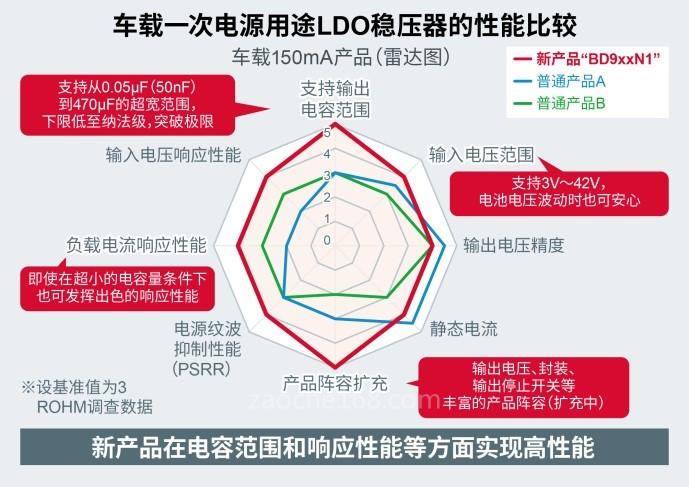新產(chǎn)品是搭載了ROHM自有的超穩(wěn)定控制技術(shù)“Nano Cap?”的新型車載LDO穩(wěn)壓器系列,支持低至100nF(納法:10的負(fù)九次方)的輸出電容量,不到普通產(chǎn)品1/10,而且,在輸入電壓和負(fù)載電流*2波動(dòng)的情況下,也能實(shí)現(xiàn)應(yīng)用產(chǎn)品所要求的穩(wěn)定工作(輸出電壓波動(dòng)100mV以內(nèi):負(fù)載電流波動(dòng)1mA?50mA/1μ秒時(shí))。新產(chǎn)品支持超寬范圍的輸出電容量,不僅適用于普通的數(shù)μF的小型MLCC(多層陶瓷電容器)和大容量的電解電容器,也適用于以往實(shí)際應(yīng)用中很難穩(wěn)定工作的1μF以下的0603尺寸超小型MLCC,因此,不僅有助于元器件和電路板的小型化,還可以在更廣泛的電容器條件下使用,有助于減少設(shè)計(jì)工時(shí)。