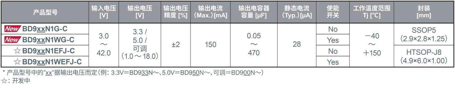 “BD9xxN1系列”是車載一次LDO系列新產(chǎn)品,滿足車載產(chǎn)品125℃以上工作和汽車電子產(chǎn)品可靠性標(biāo)準(zhǔn)“AEC-Q100”的要求,也滿足一次電源輸入電壓40V以上等基本要求。利用新搭載的超穩(wěn)定控制技術(shù)“Nano Cap?”,新產(chǎn)品能夠支持不到普通產(chǎn)品1/10的100nF輸出電容量,而且,即使在輸入電壓和負(fù)載電流波動(dòng)時(shí),也能實(shí)現(xiàn)應(yīng)用產(chǎn)品要求的穩(wěn)定性(輸出電壓波動(dòng)在100mV以內(nèi):負(fù)載電流波動(dòng)1mA?50mA/1μ秒時(shí))。圍繞支持輸出電容范圍和響應(yīng)性能,提供各項(xiàng)性能均衡的業(yè)界高性能產(chǎn)品。