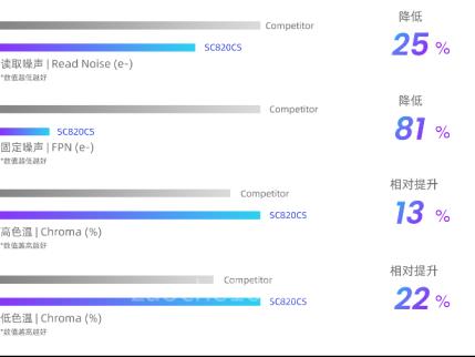 此次發(fā)布的兩款手機(jī)應(yīng)用新品均搭載了思特威創(chuàng)新的SFCPixel?專利技術(shù),SC520CS與SC820CS的感光度均可達(dá)840mV/lux·s,讓手機(jī)攝像頭即使在低光照拍攝環(huán)境中,也能擁有優(yōu)異的夜視成像性能。同時(shí)得益于思特威超低噪聲外圍讀取電路技術(shù)的加持,兩款新品均具有出色的噪聲控制性能。以SC820CS為例,相較業(yè)內(nèi)同規(guī)格產(chǎn)品,其讀取噪聲(RN)與固定噪聲(FPN)分別大幅降低了25%與81%,能夠?yàn)槭謾C(jī)攝像頭帶來極佳的夜拍成像效果。在色彩呈現(xiàn)力方面,SC820CS的Chroma高低色溫分別相對提升了13%與22%,讓影像更為艷麗,色彩更加真實(shí)。