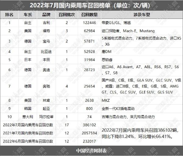 根據(jù)國(guó)家市場(chǎng)監(jiān)督管理總局缺陷產(chǎn)品管理中心7月發(fā)布的召回公告,中國(guó)經(jīng)濟(jì)網(wǎng)汽車頻道經(jīng)過(guò)匯總、統(tǒng)計(jì),整理出“2022年7月國(guó)內(nèi)乘用車召回榜單”。7月,共有10個(gè)汽車品牌累計(jì)發(fā)布16起公告,共計(jì)召回乘用車386102輛,同比下降81.24%,環(huán)比增長(zhǎng)66.41%。