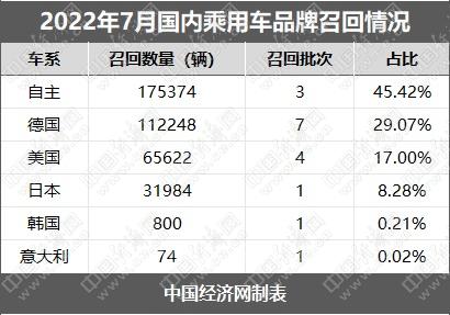 此外,美系共召回乘用車65622輛,占比17.00%;日系召回31984輛,占比8.28%;韓系和意系召回均不足千輛。