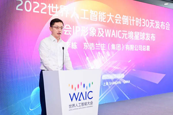 ▲ 東浩蘭生(集團)有限公司總裁李棟發(fā)布大會IP形象、WAIC元境星球