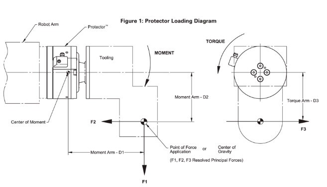 通過圖1,能夠?qū)⒘D(zhuǎn)換成末端執(zhí)行工具施加到碰撞傳感器上的合力矩,轉(zhuǎn)矩,以及軸向負(fù)載。利用圖1的曲線和下面的公式來計算最差情況下的負(fù)載。所有三個量-軸向負(fù)載,轉(zhuǎn)矩和剪切力矩-都應(yīng)該考慮其動態(tài)的,靜態(tài)的,以及合力的作用情況。