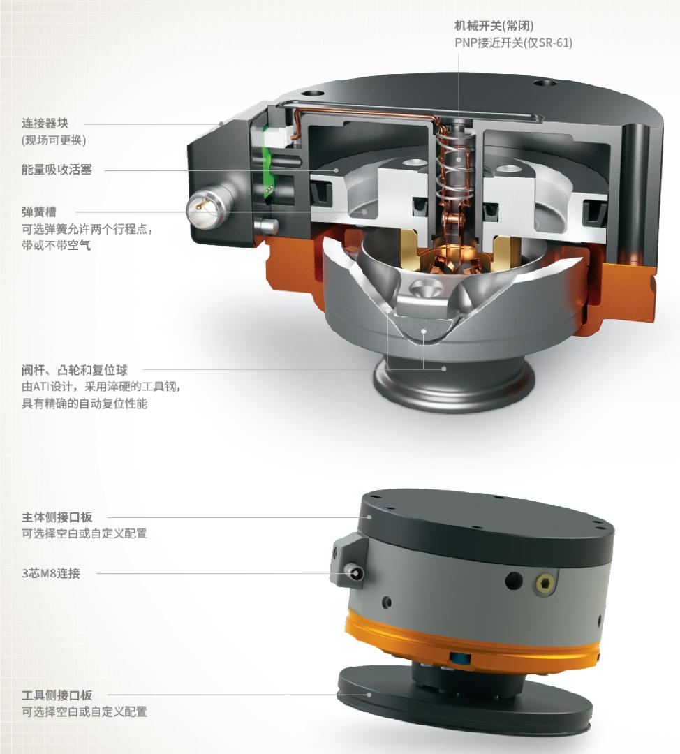 能量吸收:碰撞產(chǎn)生的能量在氣缸內(nèi)被吸收,工具不會因發(fā)生碰撞而被損壞;離開碰撞點,傳感器吸收能量后被釋放,產(chǎn)品能自動恢復(fù)到原來的位置跳變一致性:傳感器無論是在水平方向、軸向、轉(zhuǎn)角等不同方向發(fā)生碰撞,跳變壓力一樣