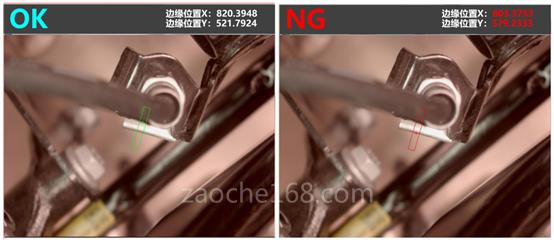 同樣的,通過邊緣位置計算,首先定義正確安裝狀態(tài)下的邊緣位置X軸和Y軸的坐標(biāo)點(diǎn)。之后的每一個也與此坐標(biāo)值進(jìn)行對比,一旦坐標(biāo)值出現(xiàn)偏差則說明卡子并未安裝到位,判斷為NG。