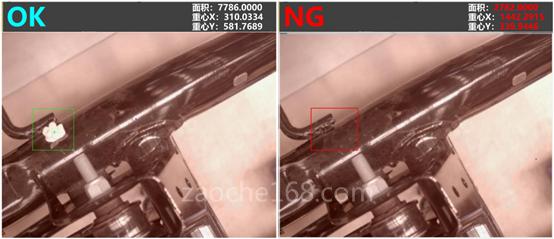 除了邊緣位置計算之外,亦可通過觀察顏色面積,例如圖中的白色卡子,首先定義正確安裝狀態(tài)下白色面積的大小。之后的每一個,都觀察并對比畫像中白色所覆蓋的面積值,一旦出現(xiàn)偏差則說明卡子并未安裝到位,判斷為NG。