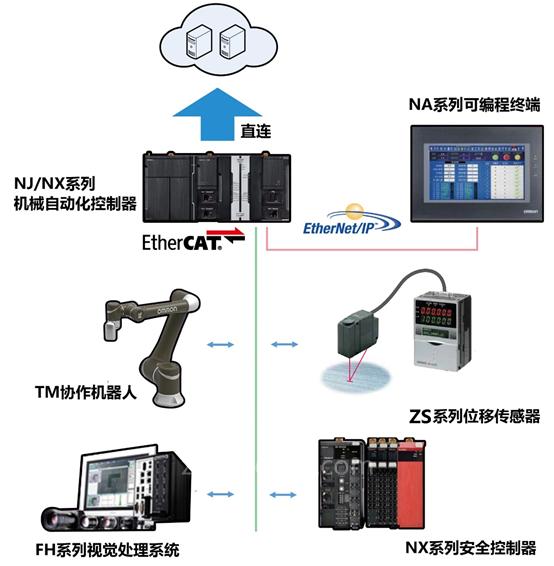 1、通過歐姆龍的NJ/NX系列作為邏輯控制系統(tǒng),與TM協(xié)作機(jī)器人進(jìn)行通訊指揮檢查工作。