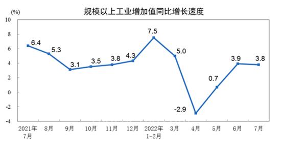 今日,國家統(tǒng)計局發(fā)布數(shù)據(jù)顯示,7月,全國規(guī)模以上工業(yè)增加值環(huán)比增長0.38%,同比增幅相比上月回落0.1個百分點至3.8%。1-7月,全國規(guī)模以上工業(yè)增加值同比增長3.5%,比1-6月加快0.1個百分點。