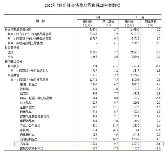 聚焦汽車類消費,7月,汽車類消費總額為3824億元,同比上升9.7%;1-7月,汽車消費總額達到24970億元,同比下滑3.6%。
