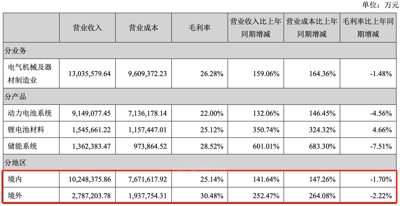 寧德時代積極布局海外工廠背后,是其海外業(yè)務(wù)的快速發(fā)展。公司年報數(shù)據(jù)顯示,2019年海外收入僅占寧德時代全部營收的4.37%,2020年迅速增長至15.71%;2021年,公司有278.7億元收入來自海外,占全部營業(yè)收入的21.38%,同比增長252.47%,遠超過當年國內(nèi)收入141.64%的同比增長率。在毛利率方面,海外市場也有明顯優(yōu)勢,2021年,寧德時代在國內(nèi)的毛利率為25.14%,而海外市場毛利率則達30.48%。