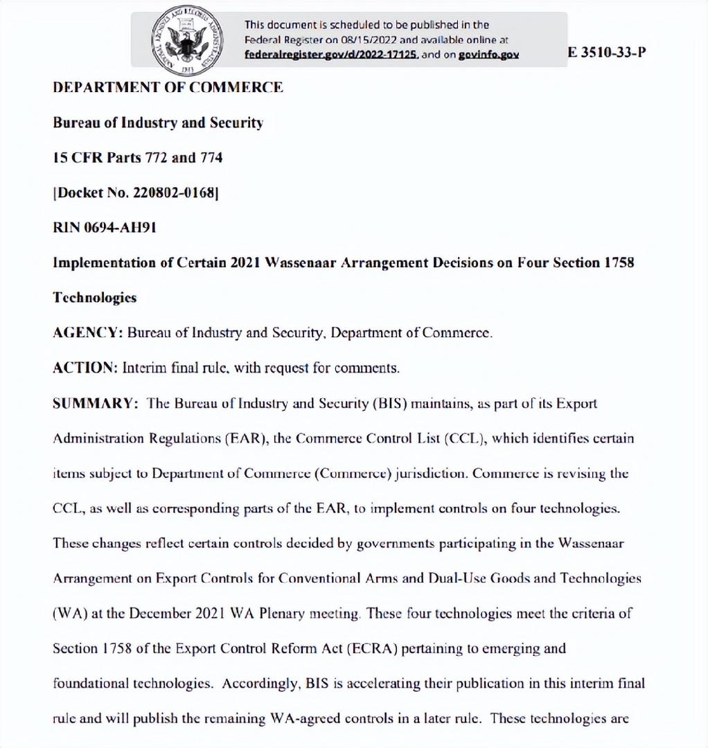 當地時間上周五(8月12日),美國商務部工業(yè)和安全局(BIS)在《聯邦公報》中披露了一項新增的出口限制臨時最終規(guī)則,對設計GAAFET(全柵場效應晶體管)結構集成電路所必須的EDA/ECAD軟件;金剛石和氧化鎵為代表的超寬禁帶半導體材料;燃氣渦輪發(fā)動機使用的壓力增益燃燒(PGC)等四項技術實施新的出口管制,禁令生效日期為今天(8月15日)。