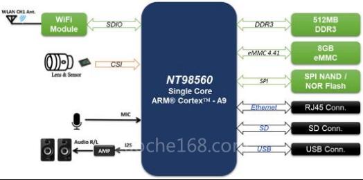 在硬件設(shè)計(jì)方面,方案采用的NT98560是NOVATEK旗下一款高集成的SoC,具有高畫質(zhì)、低碼率、低功耗,適用于2Mp至5Mp Edge-IP Camera應(yīng)用。此SoC采用ARM Cortex-A9 CPU內(nèi)核,集成了新一代ISP、H.265/H.264視頻壓縮編解碼器、高性能硬件DLA模塊、圖形引擎、顯示控制器,能夠?yàn)閿z像頭設(shè)備提供清晰的圖像。另外,NT98560也支持以太網(wǎng)PHY、USB2.0主機(jī)/設(shè)備、音頻編解碼器、RTC和SD/SDIO3.0,為用戶提供理想性價(jià)比的消費(fèi)級(jí)AI IP攝像機(jī)解決方案。