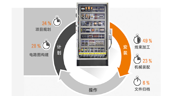 在日常的電氣柜裝配過程中,常常會(huì)面臨費(fèi)時(shí)費(fèi)力的巨大煩惱。根據(jù)德國“裝配機(jī)柜4.0”研究結(jié)果,傳統(tǒng)裝配機(jī)柜過程最耗時(shí)的是規(guī)劃和安裝階段。而其中,項(xiàng)目規(guī)劃和電路圖構(gòu)建占據(jù)了50%以上的規(guī)劃時(shí)間;機(jī)械裝配和線束加工,更是占據(jù)了安裝階段70%以上的時(shí)間。