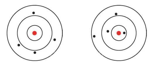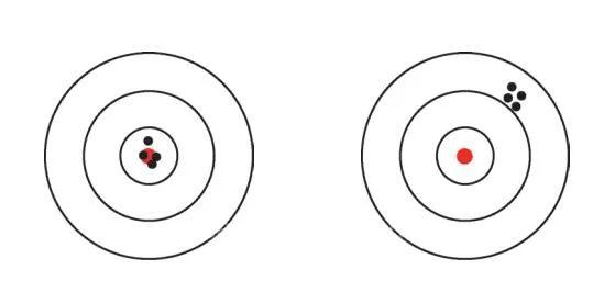 a)偏倚小、波動小 b)偏倚大、波動小