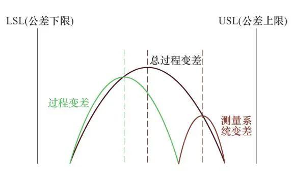 對于整個制造過程而言,過程的總變差一半來自過程本身,一半來自測量系統(tǒng)。圖3為變差組成。好的測量系統(tǒng),能夠產(chǎn)生優(yōu)質(zhì)的測量數(shù)據(jù),優(yōu)質(zhì)的測量數(shù)據(jù)代表著無限接近于真值。構(gòu)成測量系統(tǒng)的要素很多,諸如人(測量人員)、環(huán)境、被測物和測量過程等,這里最重要的一點是量具本身,而量具的選取,要特別關(guān)注測量系統(tǒng)研究。