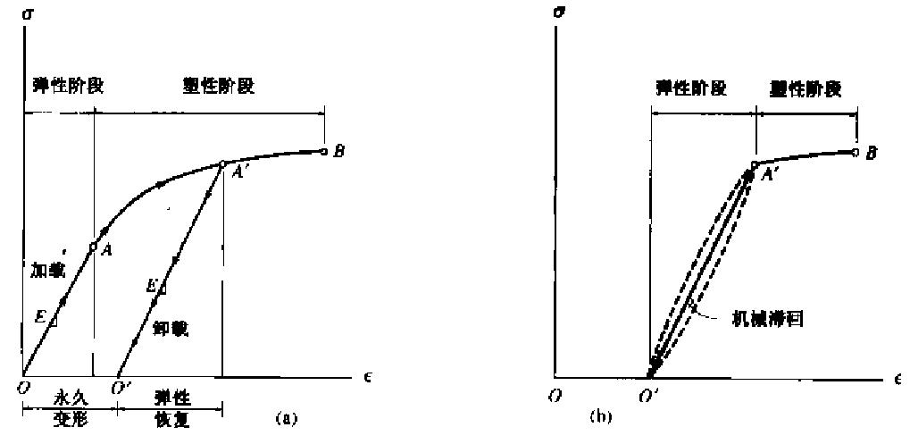 若試件為塑性材料,被加載至塑性階段后再卸載,則當(dāng)材料返回平衡狀態(tài)時,彈性應(yīng)變消失,而塑性應(yīng)變不會消失,結(jié)果材料出現(xiàn)永久變形,如圖a所示。該過程稱為應(yīng)變強化或者冷作硬化。這樣,雖然比例極限提高了,但是在一定程度上降低了塑性,增加了脆性。從圖a中可以看出,強化前后,曲線線性段的直線趨于平行,斜率相同,彈性模量相同。實際上,試件從A’點卸載,再加載至同一點會損失部分熱量或能量,因而加載和卸載過程的曲線并不重合,如圖b虛線所示,會存在一個機械滯回區(qū)。在選擇振動結(jié)構(gòu)或機械設(shè)備的阻尼器材料時,要重點考慮其機械滯回特性。