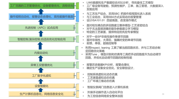 第二步實(shí)現(xiàn)控制優(yōu)化:在這一步首先要實(shí)現(xiàn)異常工況管理,確定聯(lián)鎖、報(bào)警和正常操作范圍的邊界,遵循報(bào)警管理標(biāo)準(zhǔn)借助報(bào)警主數(shù)據(jù)庫(kù)軟件平臺(tái)實(shí)現(xiàn)報(bào)警合理優(yōu)化、聯(lián)鎖管理優(yōu)化,盡量減少工廠生產(chǎn)異常狀態(tài)比例,減少操作人員處理異常工況的實(shí)踐,從而降低操作負(fù)荷;其次盡量實(shí)現(xiàn)內(nèi)操的自動(dòng)化,采用數(shù)字化回路優(yōu)化工具軟件,利用自學(xué)習(xí)等先進(jìn)快速提升整個(gè)生產(chǎn)線控制回路的自動(dòng)化率,降低內(nèi)操的手工操作比例,從而進(jìn)一步操作負(fù)荷,自動(dòng)化率提升后,在對(duì)一些復(fù)雜的回路采用串級(jí)、分程、前饋、超馳、自適應(yīng)控制等智能控制策略進(jìn)一步優(yōu)化回路性能,而對(duì)相互耦合現(xiàn)象嚴(yán)重的回路考慮使用APC進(jìn)行建模優(yōu)化,降低生產(chǎn)波動(dòng),實(shí)現(xiàn)生產(chǎn)卡邊優(yōu)化,提高生產(chǎn)效率。