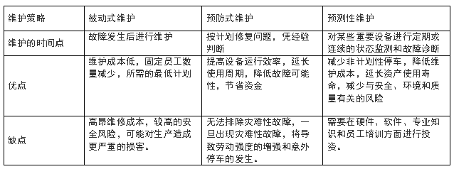 當前生產(chǎn)企業(yè)所采用的運維方式通常分為三種:被動式維護、預防式維護和預測性維護。三種運維方式的對比如下表所示: