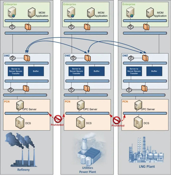 由于化工、石油&天然氣以及公用事業(yè)公司的嚴(yán)格網(wǎng)絡(luò)安全政策,其與第三方系統(tǒng)的集成變得非常具有挑戰(zhàn)性。針對此類問題,虹科可以提供一個(gè)基于OPC的解決方案實(shí)現(xiàn)這種集成,且同時(shí)符合ISA 99網(wǎng)絡(luò)安全標(biāo)準(zhǔn)和不同利益相關(guān)者的安全政策。此類系統(tǒng)已有成功部署,實(shí)現(xiàn)了煉油廠、公用事業(yè)、油氣穩(wěn)定化以及液化天然氣工廠的整合。