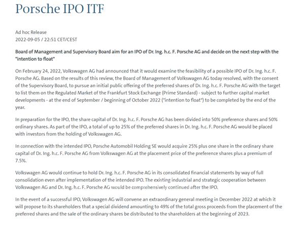2022年2月,大眾集團首次公布籌劃保時捷IPO上市。公告稱,管理委員會和監(jiān)事會簽訂框架協(xié)議,并決定評估保時捷潛在IPO的可行性。同時公告顯示,若交易成功,股東將獲得總收益49%的特別股息。