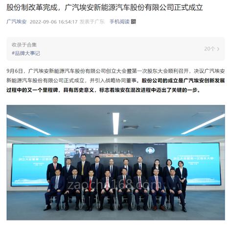 9月6日公布的公告還表示,股份公司的成立標志著埃安在混改進程中邁出了關(guān)鍵的一步。
