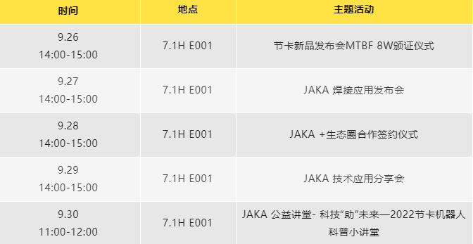9月26-30日,第 23 屆中國國際工業(yè)博覽會(huì)將在上海舉行,節(jié)卡機(jī)器人將重磅發(fā)布兩大新品:JAKA RoboHub和JAKA MIG/MAG焊接應(yīng)用?,F(xiàn)場(chǎng)還將模擬嚴(yán)苛工況下的生產(chǎn)環(huán)境,真機(jī)演示JAKA Pro系列協(xié)作機(jī)器人IP68防護(hù)等級(jí)應(yīng)用,更有JAKA+生態(tài)圈發(fā)布技術(shù)交流會(huì)、JAKA技術(shù)應(yīng)用分享會(huì)、公益講堂、互動(dòng)游戲等超多精彩活動(dòng)。