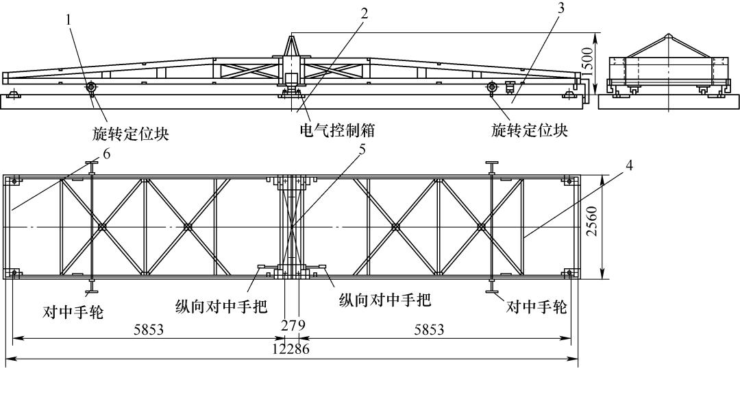 4)自動(dòng)對(duì)中調(diào)整裝置(見圖3)。為更加快捷的使工裝與車體橫向、縱向中心對(duì)齊,沿著車體縱向分別在車體中心及枕梁處設(shè)置三組對(duì)中調(diào)整設(shè)施,采用螺旋絲杠配合手輪設(shè)計(jì)[3],轉(zhuǎn)動(dòng)手輪兩側(cè)滑塊同時(shí)自動(dòng)向中部移動(dòng),可快速實(shí)現(xiàn)工裝與車體橫向自動(dòng)對(duì)中,調(diào)整方便,操作簡(jiǎn)單。