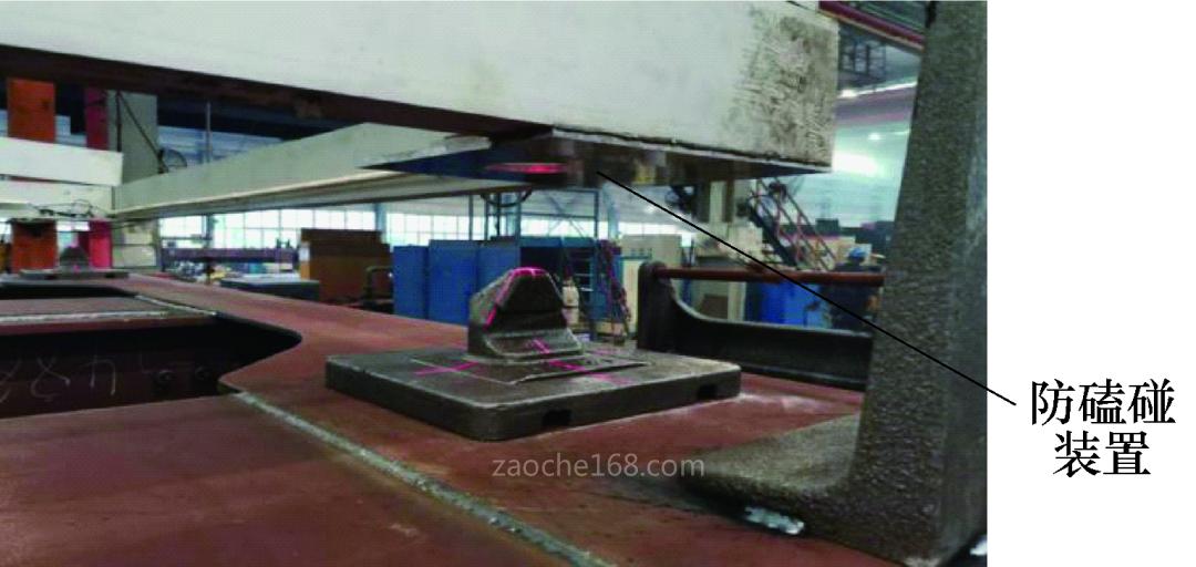 2)無(wú)障礙激光定位創(chuàng)新設(shè)計(jì)。打破傳統(tǒng)剛性定位方式,創(chuàng)新設(shè)計(jì)激光非接觸定位[2],在8個(gè)鎖頭的上方采用360°可調(diào)整的激光探頭,投射出十字激光定位線,十字交點(diǎn)即為鎖頭鷹嘴定位(見圖2),線條即為鎖座的橫向、縱向中心定位線,用來(lái)調(diào)整鎖座是否擺正,激光投射裝置離車體上平面距離較大,鎖閉裝置組裝空間大,方便操作并且工裝吊出時(shí)與配件無(wú)接觸(傳統(tǒng)工裝與工件貼嚴(yán),工裝大而重,吊出時(shí)很難把控工裝的平衡,定位塊與工件易摩擦磕碰,造成定位塊變形,影響工裝的定位精度),組裝完成后定位焊時(shí),由于工裝與工件分離,可避免焊接飛濺對(duì)工裝精度的影響。組裝時(shí)只需將鎖頭上鷹嘴紅點(diǎn)及鎖座中心分別與激光十字線對(duì)齊即可,操作簡(jiǎn)單方便,質(zhì)量可靠,同一側(cè)鎖座的直線度得到保證。
